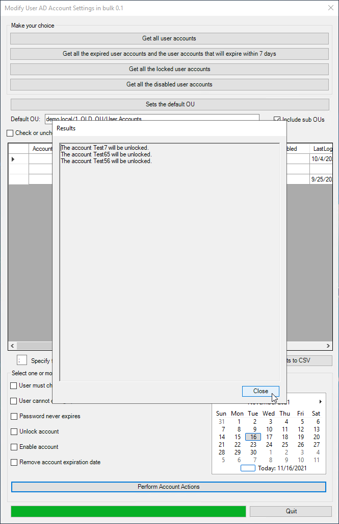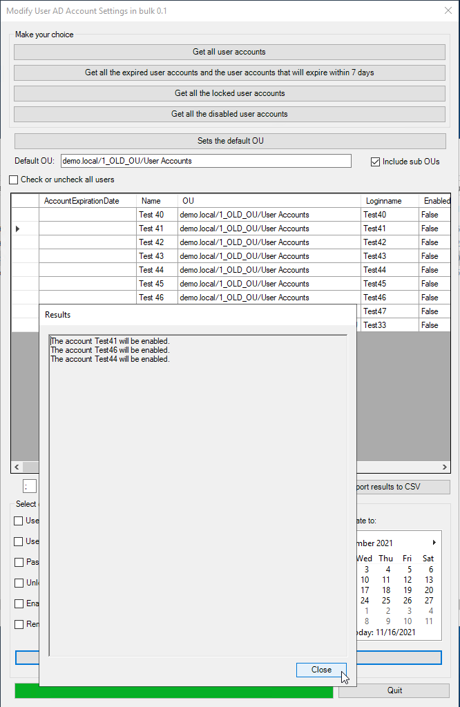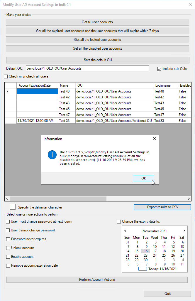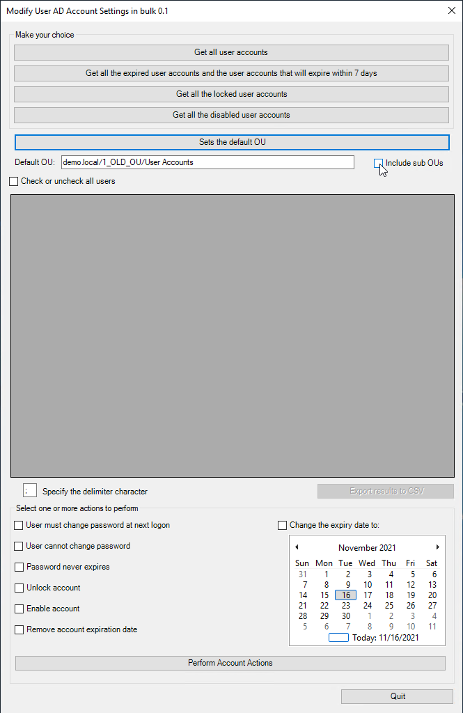 Get all the user accounts from the OU demo.local/1_OLD_OU/User Accounts and demo.local/1_OLD_OU/User Accounts/Additional OU.  |