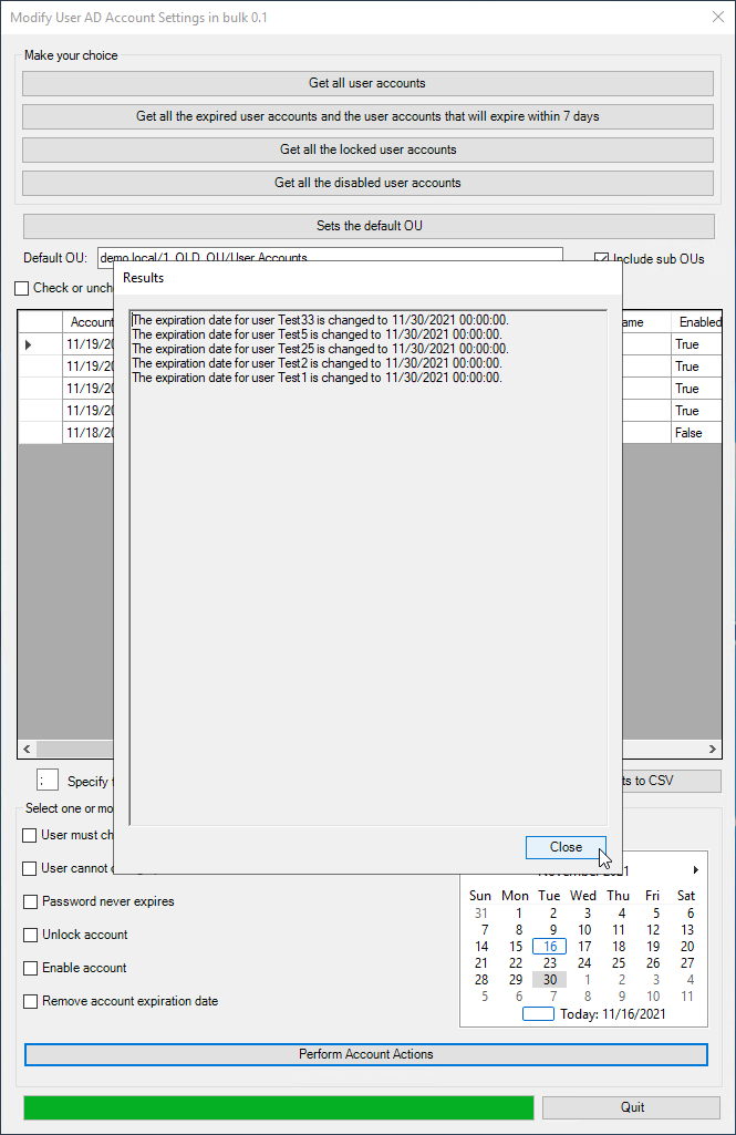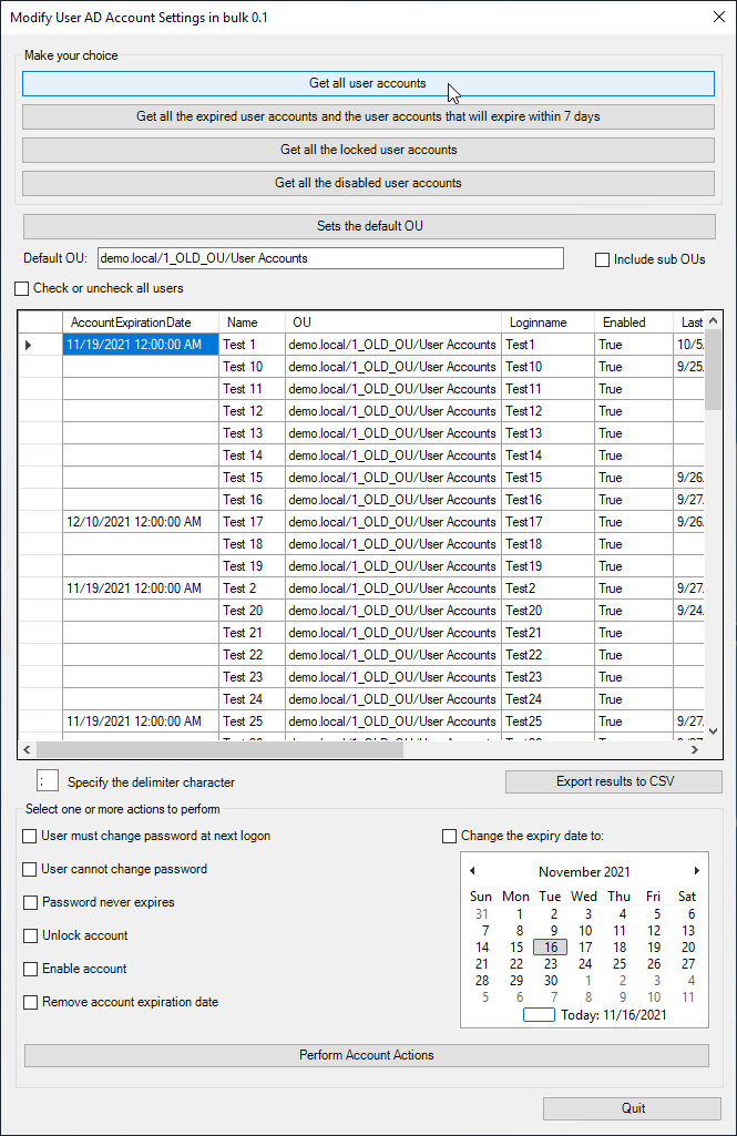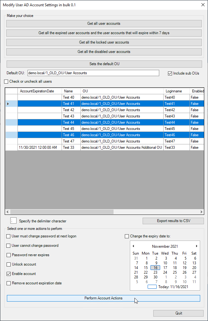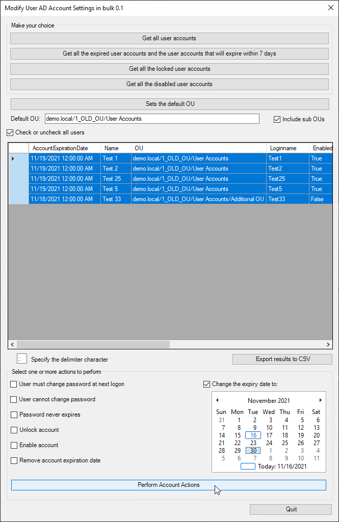 Select all the users and select Change the expiry date to: Select a date in the future. In this example, it is November 30th, 2021. Click [Perform Account Actions].  |