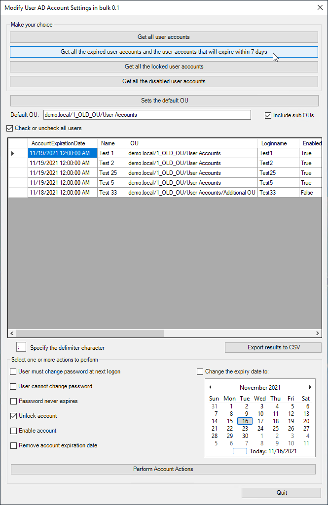 Get all the expired and about-to-expire users in the OUs demo.local/1_OLD_OU/User Accounts and demo.local/1_OLD_OU/User Accounts/Additional OU.  |