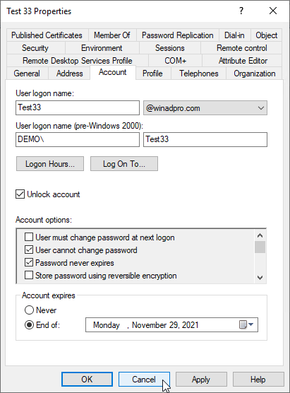 And this is how it is shown in Active Directory. With the script, the date is changed to November 30th, 2021 00:00:00 but that is the same as the end of November 29, 2021.  |