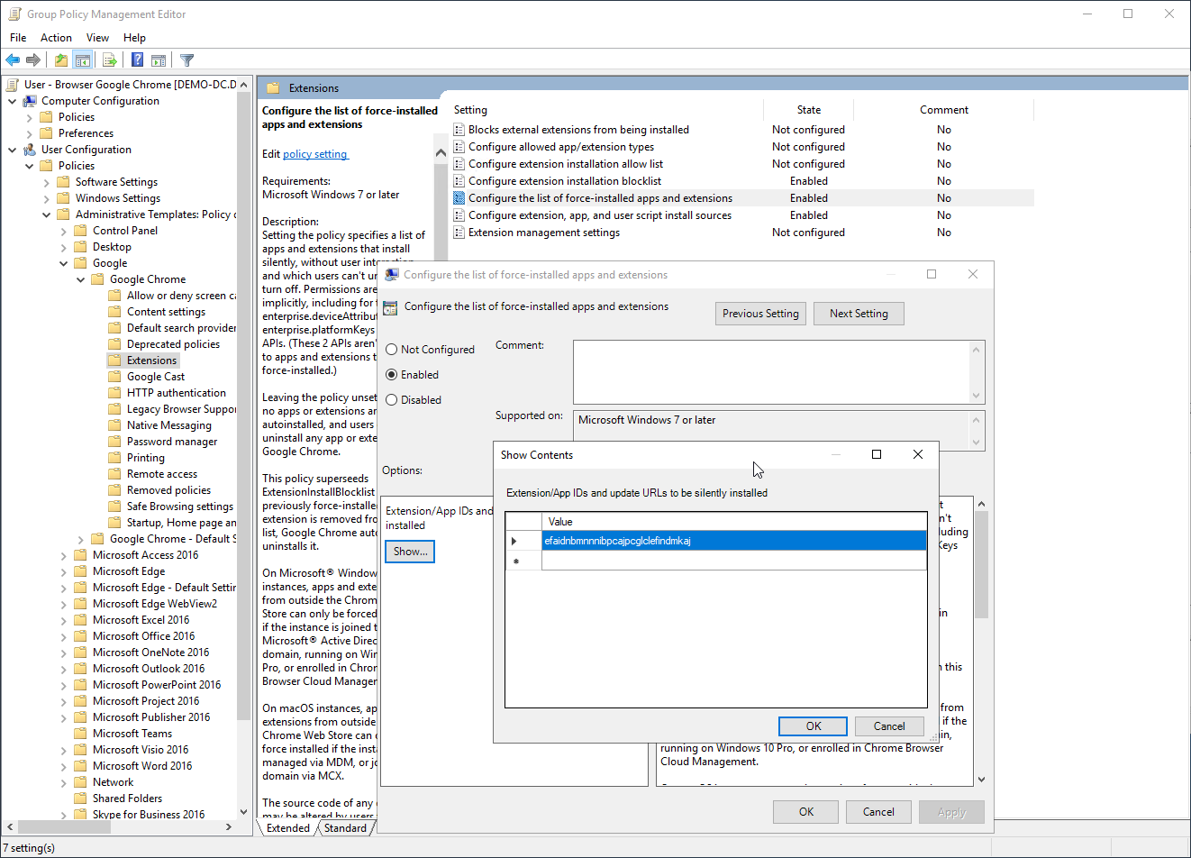 - The setting to configure the list of the explicitly allowed extensions is set via the option 'Configure the list of force-installed apps and extensions'. It will configure the registry keys under Software\Policies\Google\Chrome\ExtensionInstallforcelist.