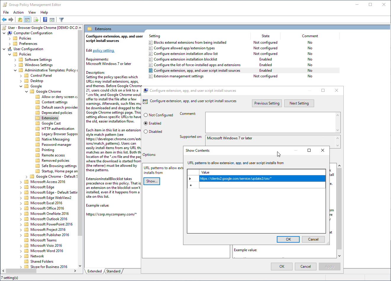 - The setting to configure the install source location is set via the option 'Configure extension, app, and user script install sources'. It will configure the registry keys under Software\Policies\Google\Chrome\ExtensionInstallSources.