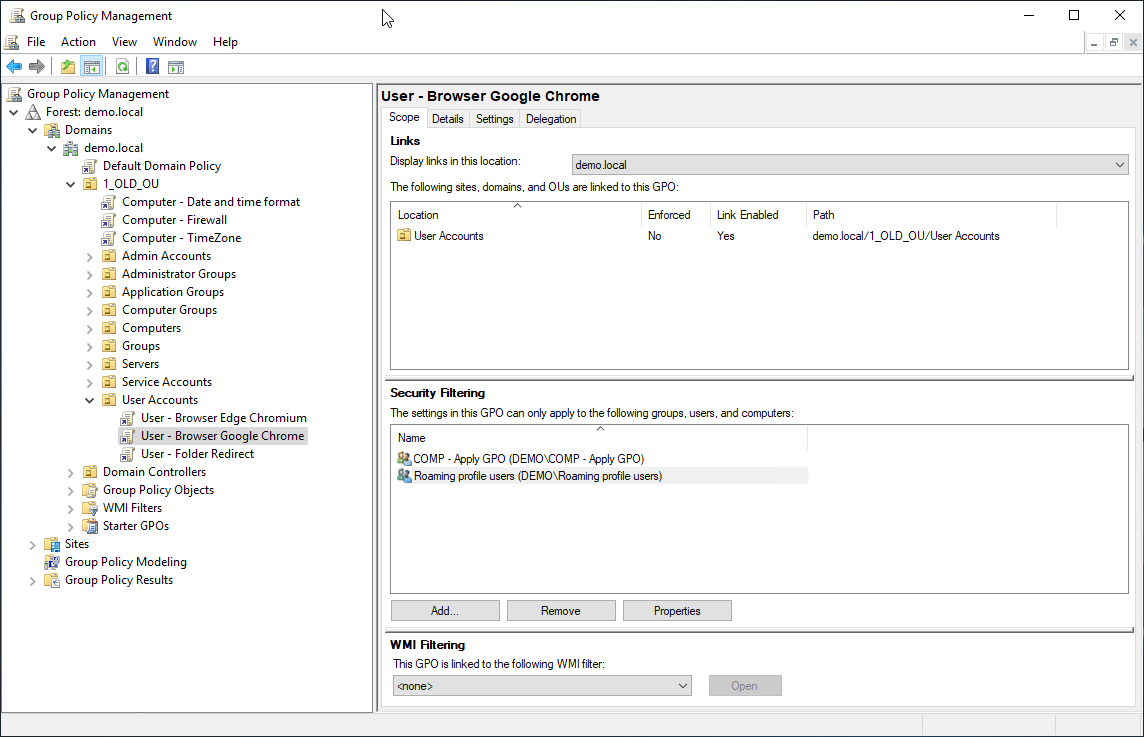 The GPO settings. In the group DEMO\COMP - Apply GPO all the computers are mentioned where the GPO should be applied on. In the group DEMO\Roaming profile users all the users who have a roaming profile are mentioned. |