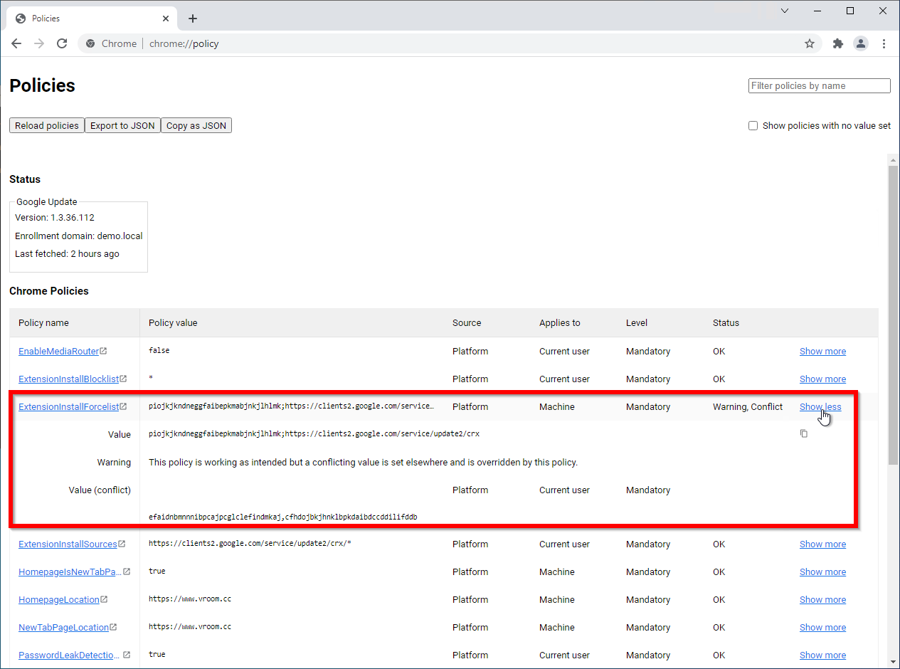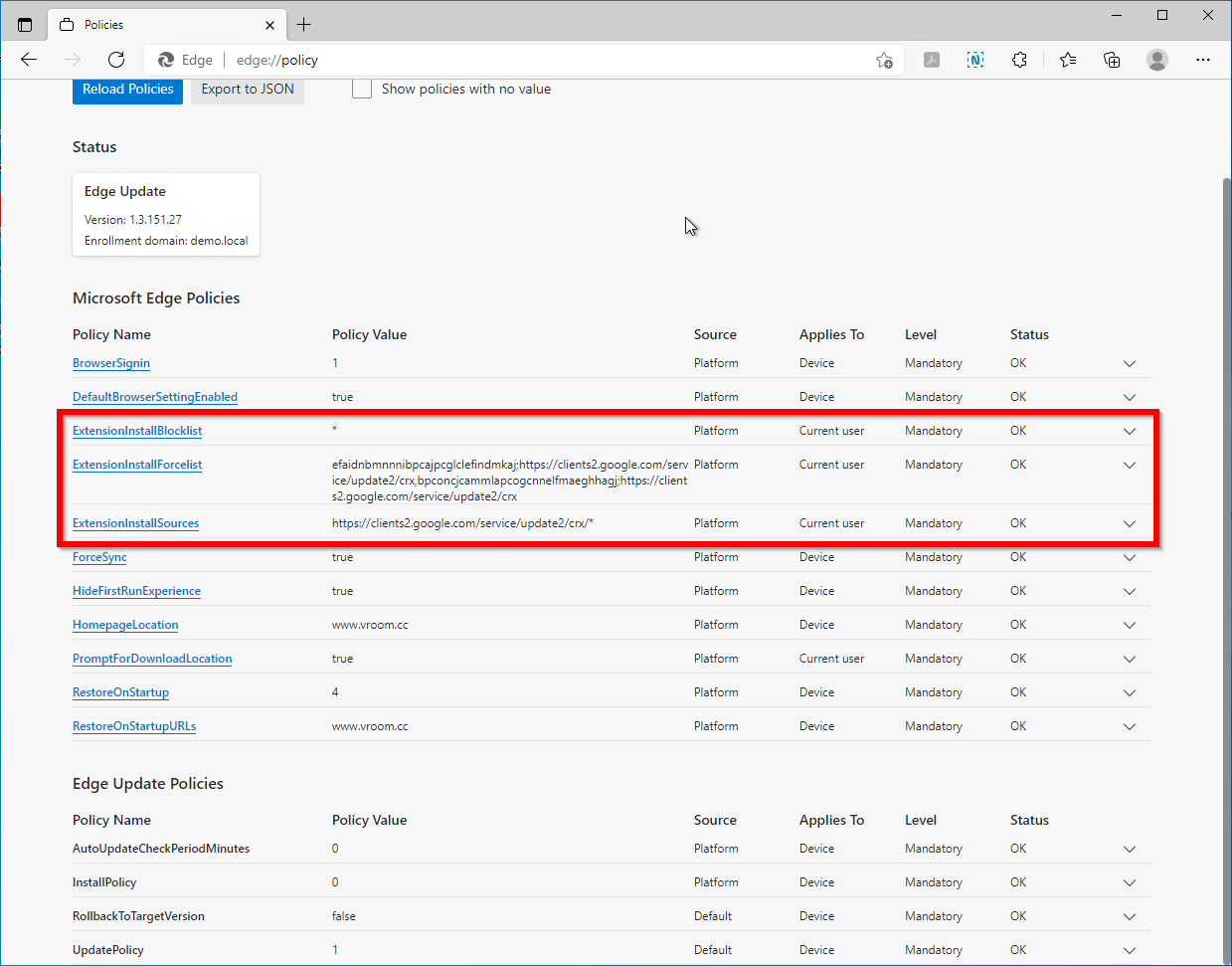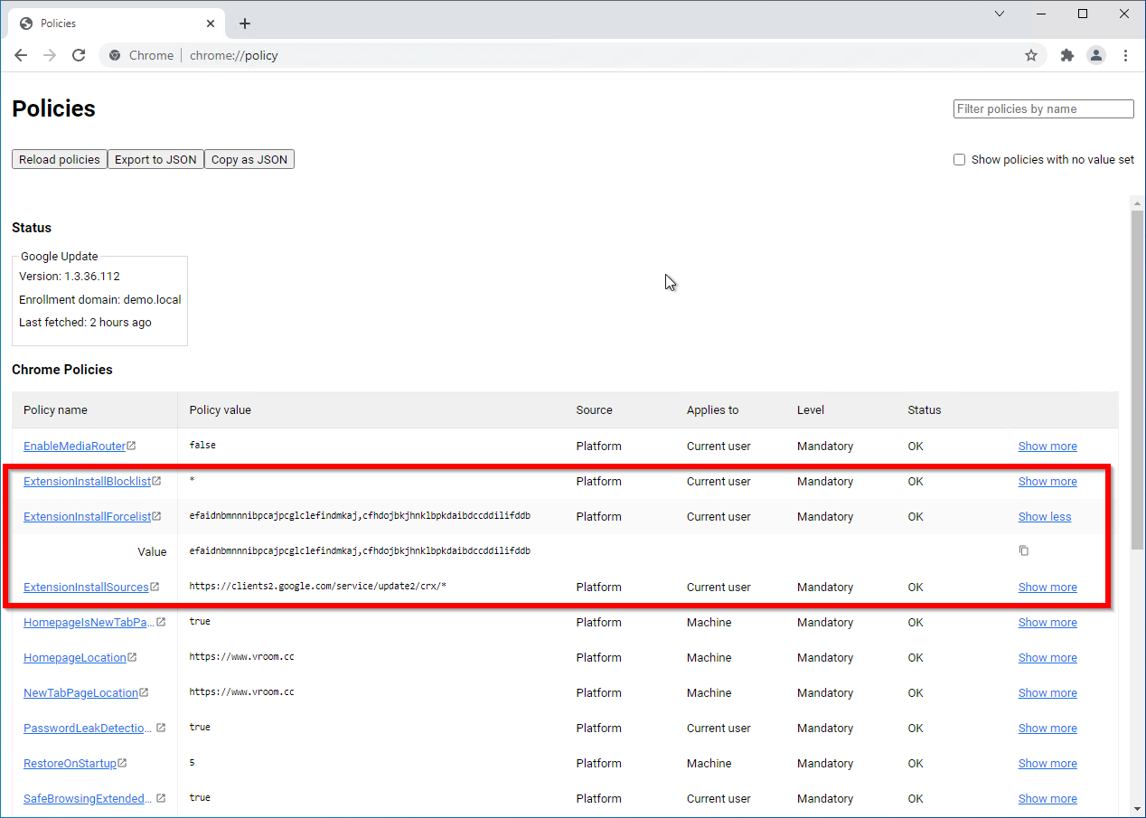 | If you browse to chrome://policy you see all the settings that are applied: |
