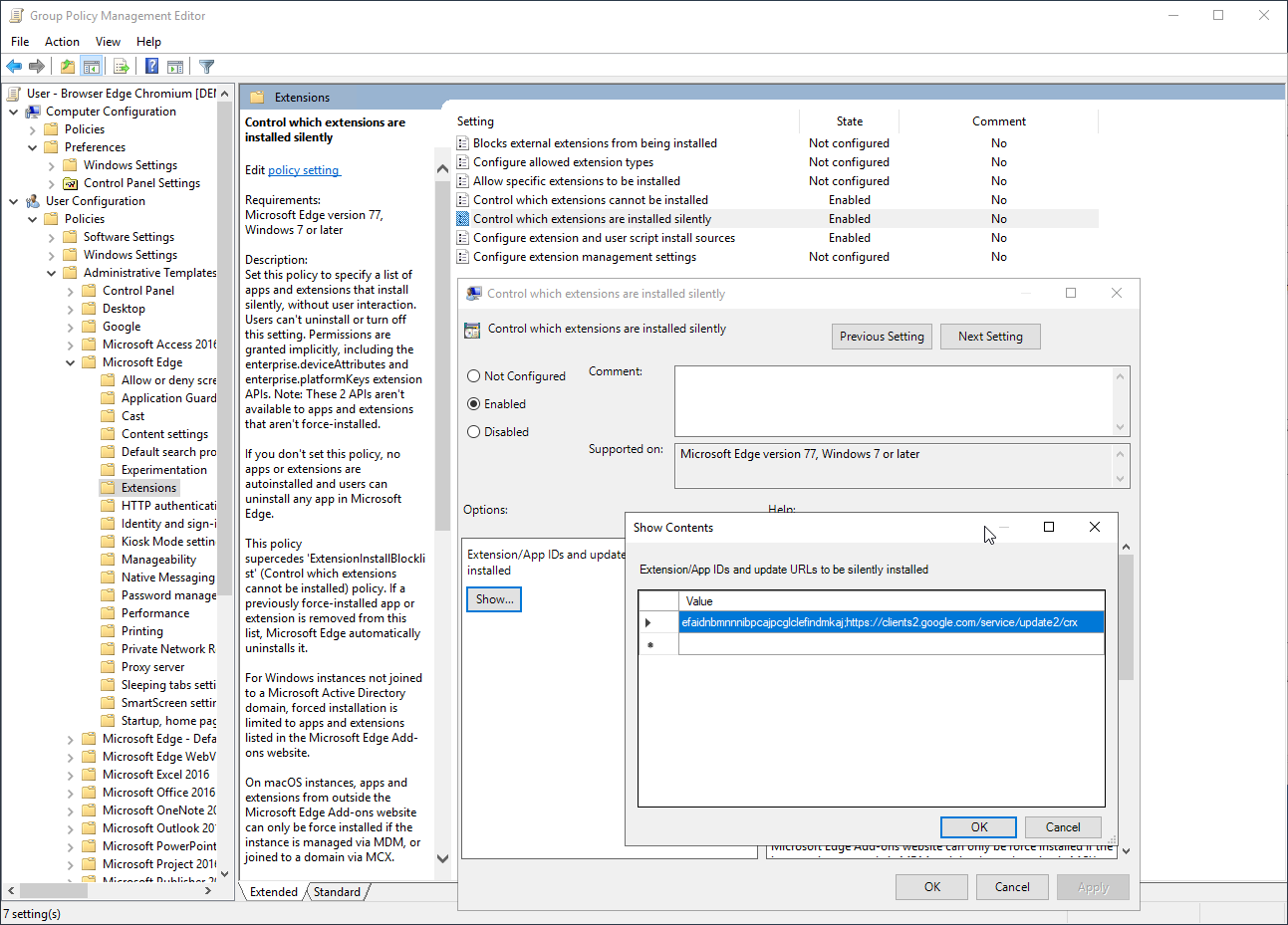 - The setting to configure the list of the explicitly allowed extensions is set via the option 'Configure the list of force-installed apps and extensions'. It will configure the registry keys under Software\Policies\Microsoft\Edge\ExtensionInstallforcelist.