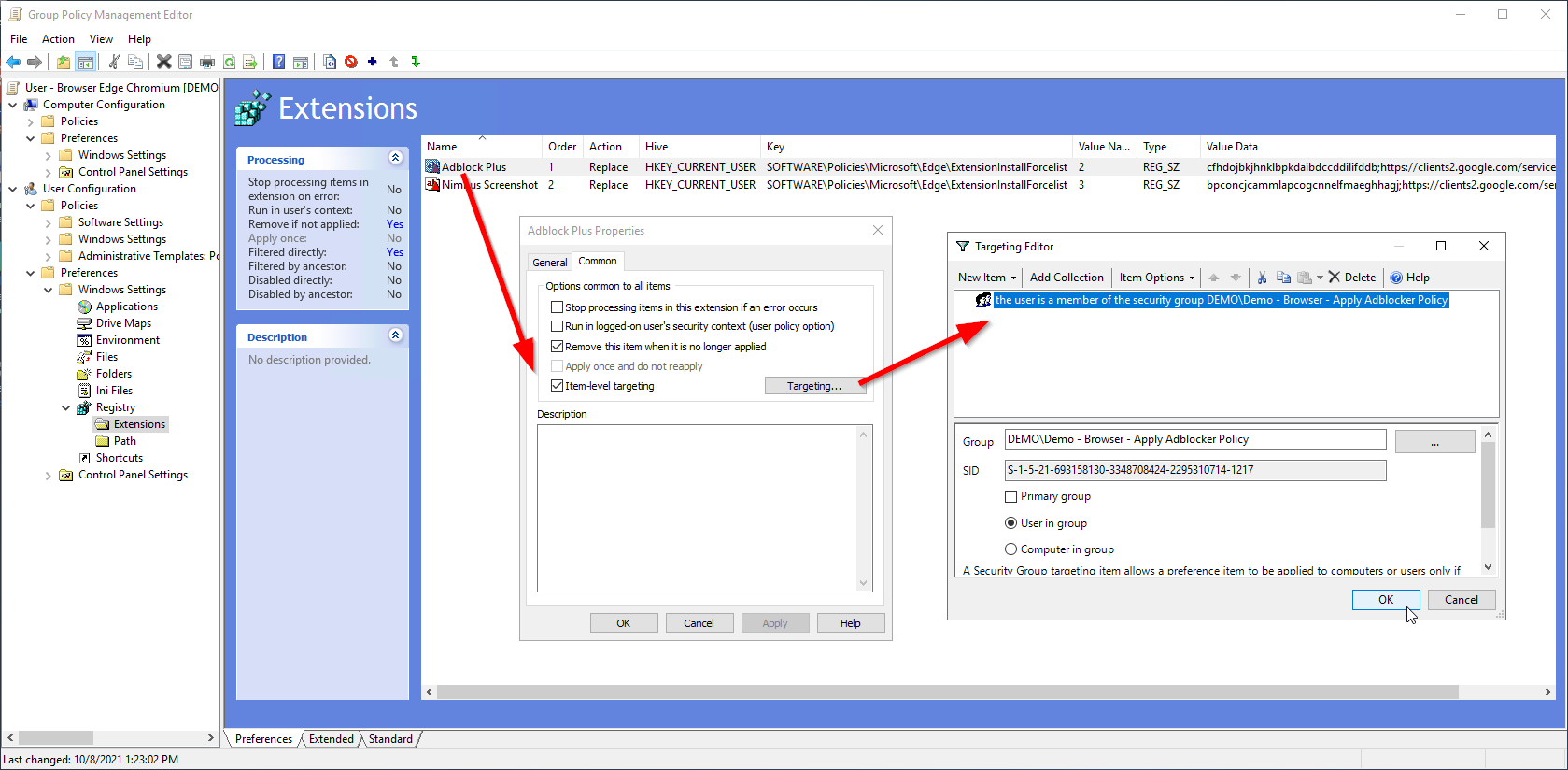 Only the users who are allowed to use Adblocker can use this extension. The setting Run in logged-on user's security context (user policy option) must be unselected. Otherwise, the setting is not set due to a permission issue. The setting Remove this item when no longer applied removes the registry setting if the user is removed from the AD group. Under Item-level targeting the AD group that is used is mentioned. Use the