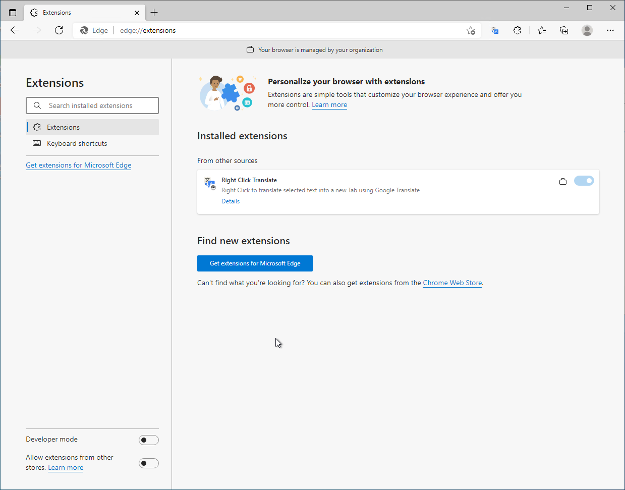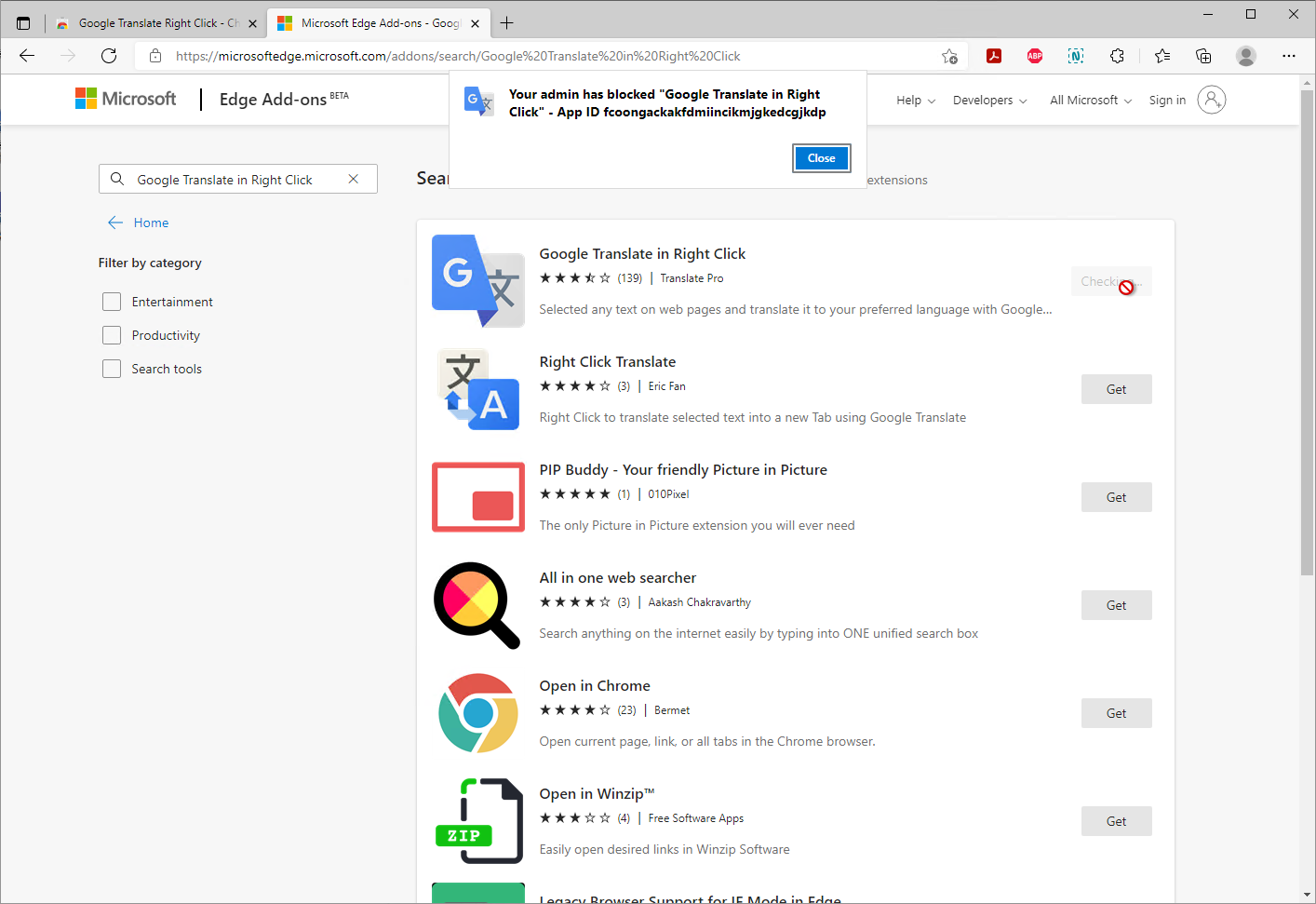 And the extension Google Translate in Right Click cannot be installed. And that is one of the desired objectives. |