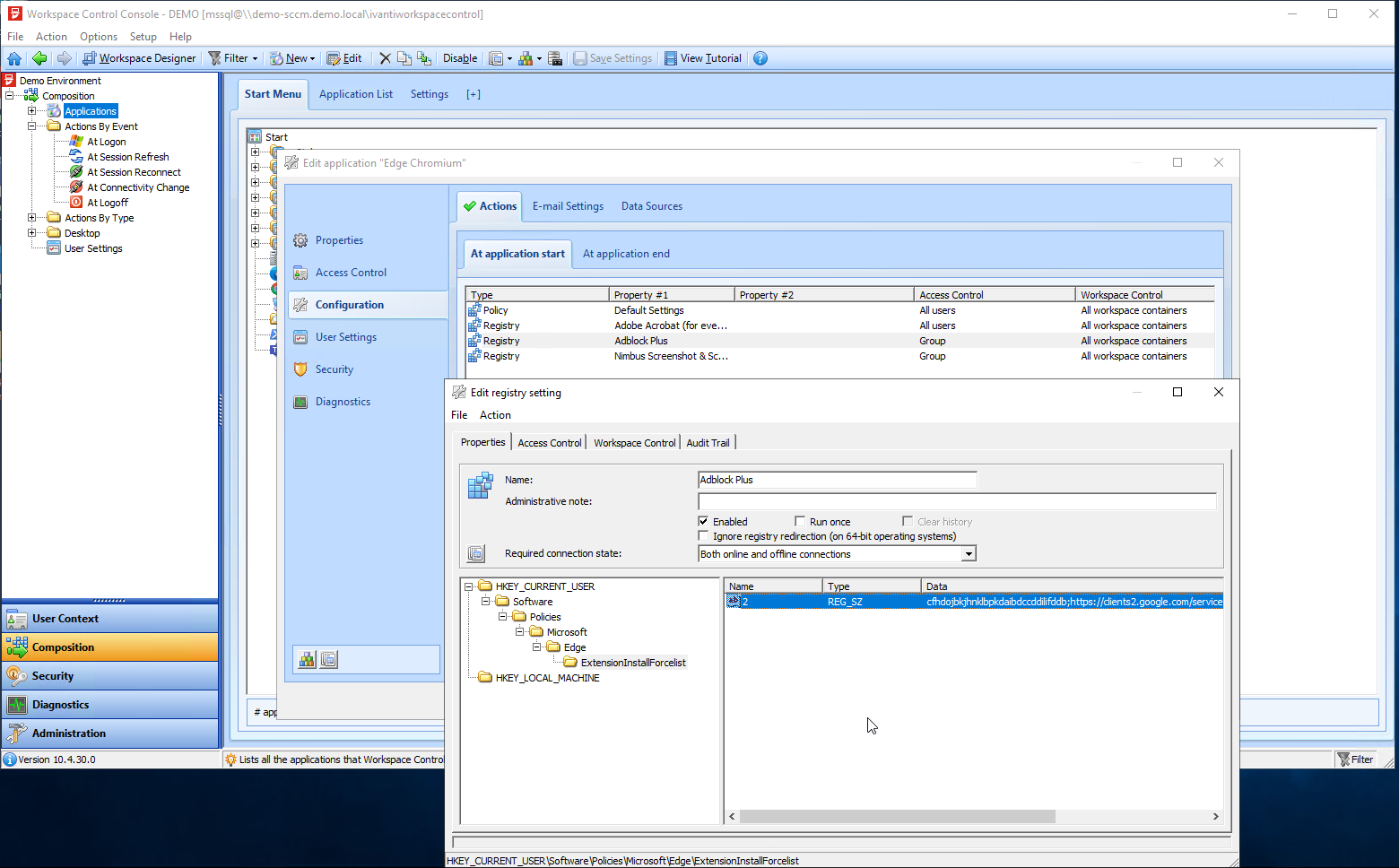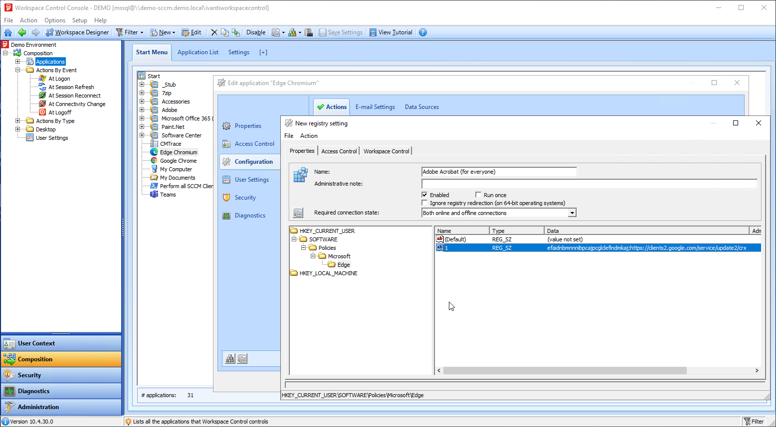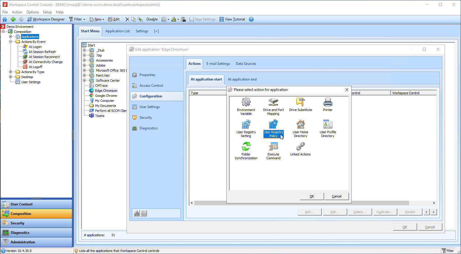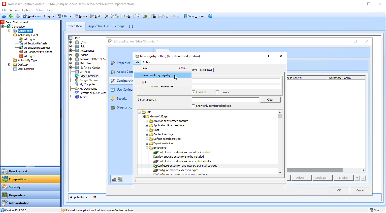 You can also configure the extensions via Ivanti Workspace Control. You configure the shortcut via Edit Application -> Configuration. Then you can either add 'User Registry Setting' or 'User Registry Policy'. In this example, I will use both options.