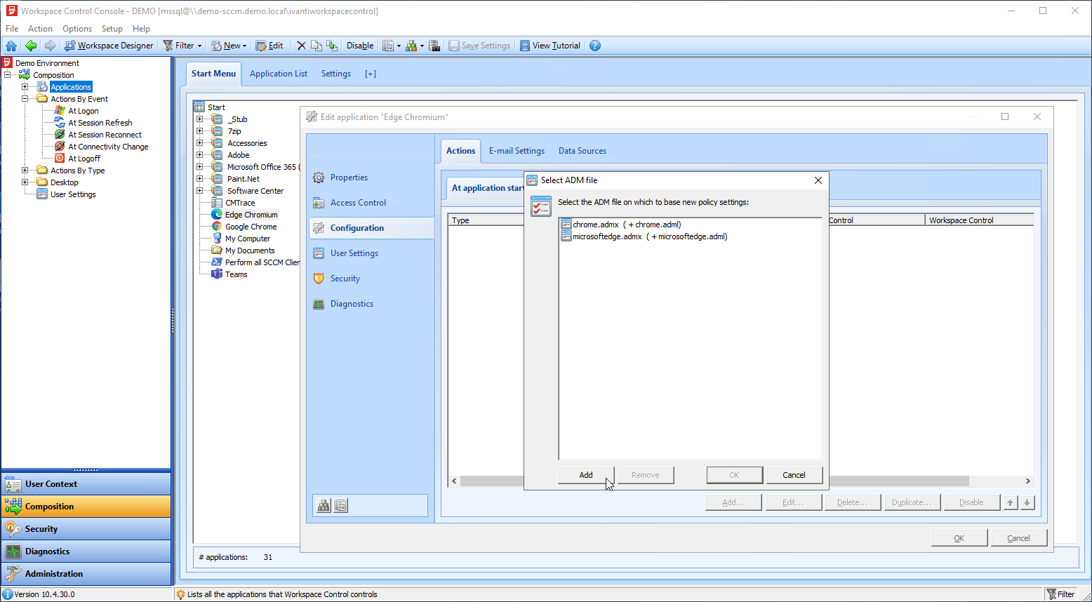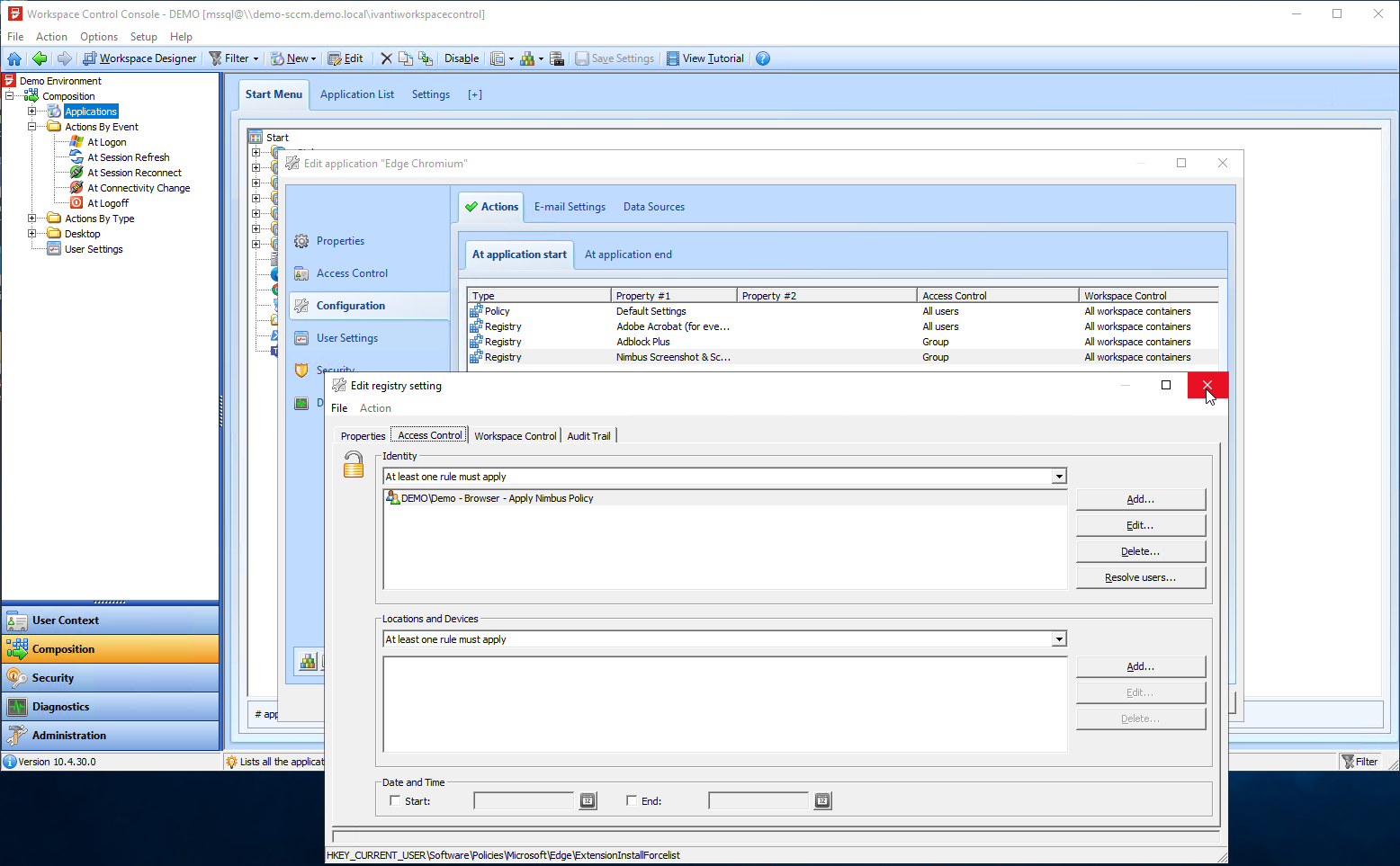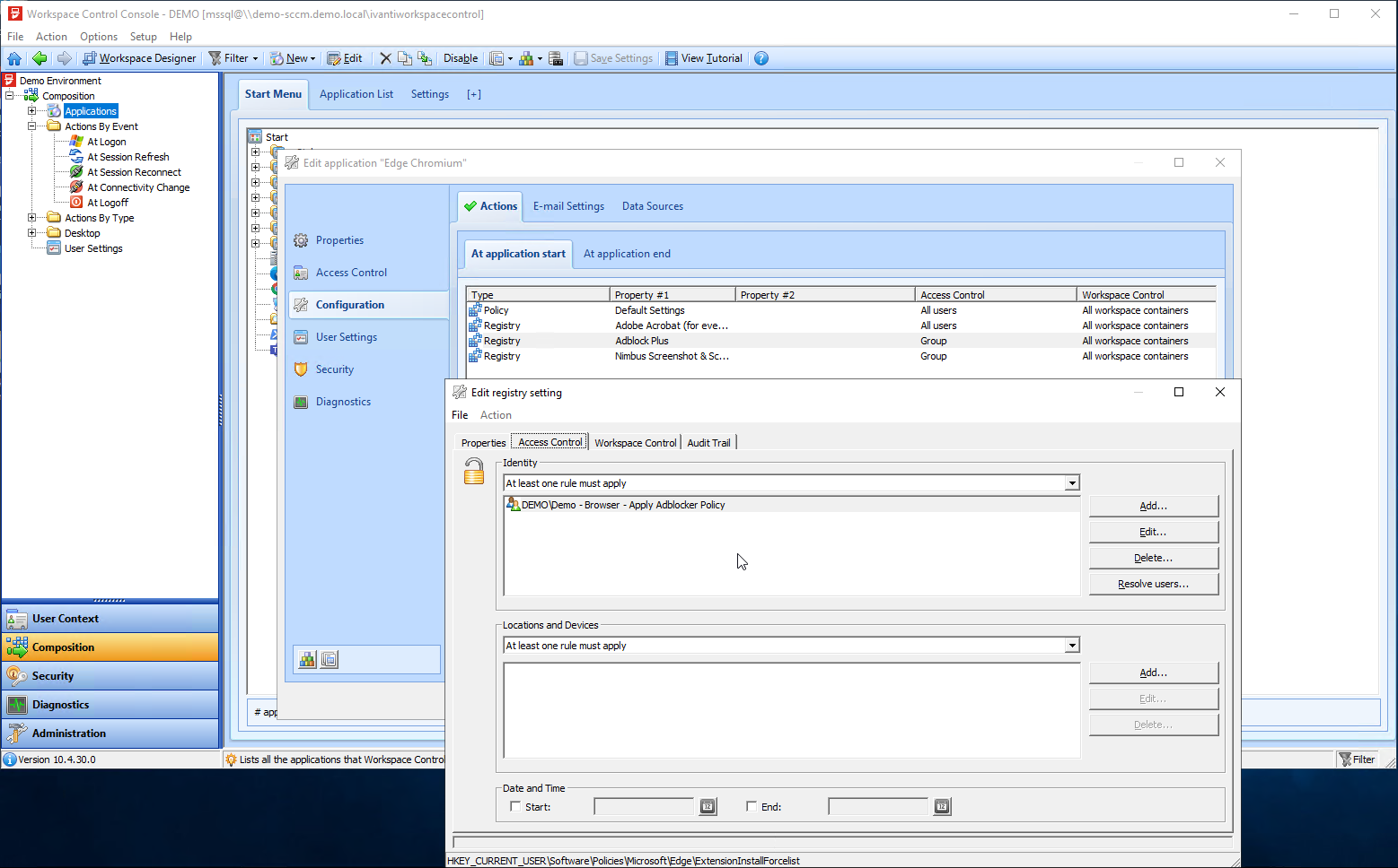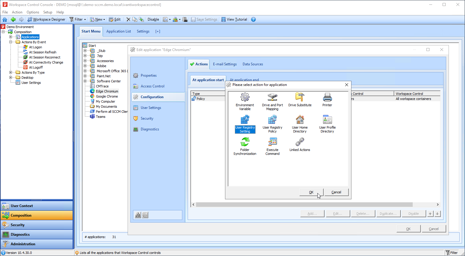 You can also configure the extensions via Ivanti Workspace Control. You configure the shortcut via Edit Application -> Configuration. Then you can either add 'User Registry Setting' or 'User Registry Policy'. In this example, I will use both options.