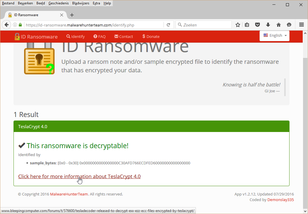 Use a virusscanner (for example Hitman Pro) to remove TeslaCrypt from your computer. | ![]() |