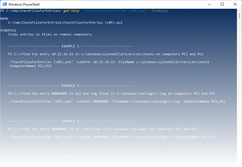 ."CheckFilesForEntries (v05).ps1" -LookFor 80004005 -FileName c:\windows\ccm\ -ComputerNames PC1,PC2 -IncludeSubFolders