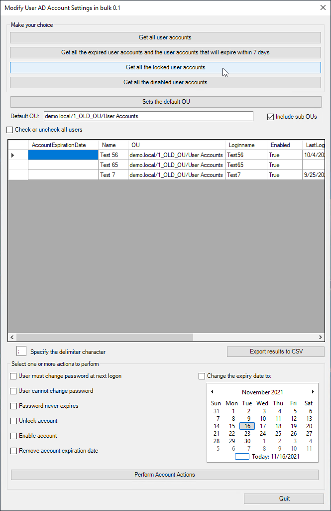 Get all the locked userids from the OUs demo.local/1_OLD_OU/User Accounts and demo.local/1_OLD_OU/User Accounts/Additional OU. |