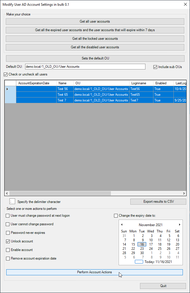 And you can perform the following actions with the selected user accounts: