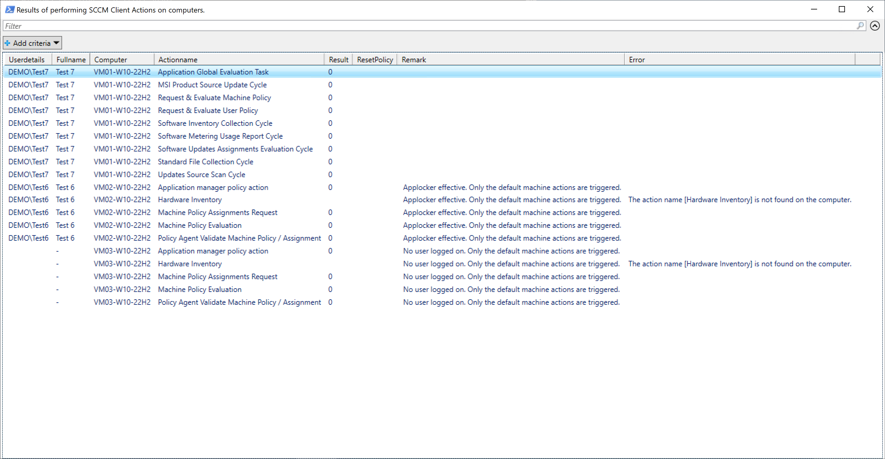 $ArrayWithAllTheActionResults | Sort-Object -Property Computer,Scope,ActionName | Out-GridView -Title "Results of performing SCCM Client Actions on computers."