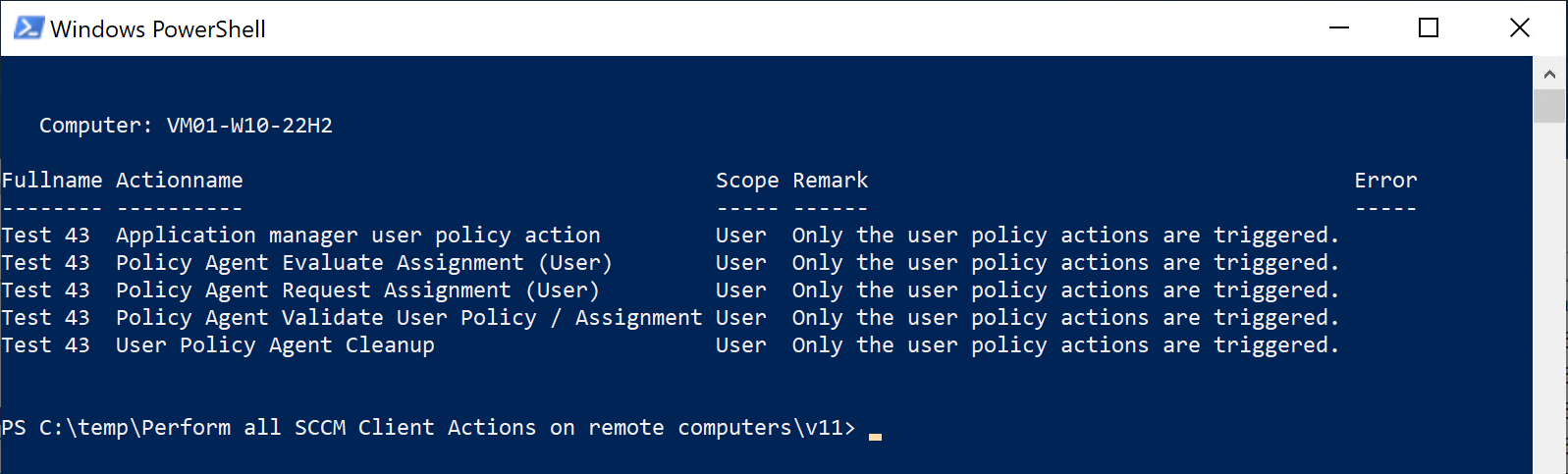 $ArrayWithAllTheActionResults | Where-Object {$_.Error} | Sort-Object -Property Computer,Scope,ActionName | Format-Table -GroupBy Computer -Property FullName,ActionName,Scope,Remark,Error