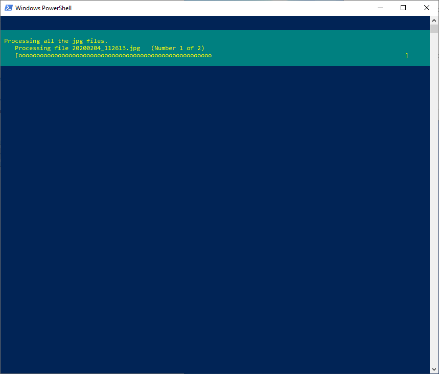 Write-Progress -Id 1 -Activity "Processing all the jpg files." -Status "Processing file $JPGFileName (Number $valCounter of $TotalJPGFiles)" -PercentComplete ($valCounter / $TotalJPGFiles * 100)