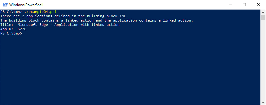 Write-Host "The building block contains a linked action and the application contains a linked action."