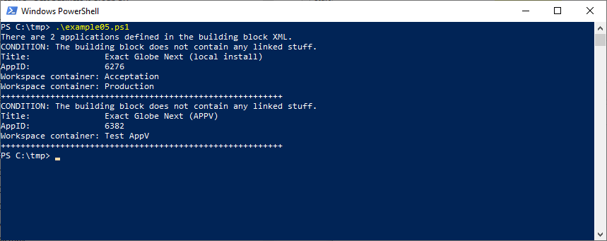 # File example05.ps1: 2 applications in the building block (extended example with workspace container)