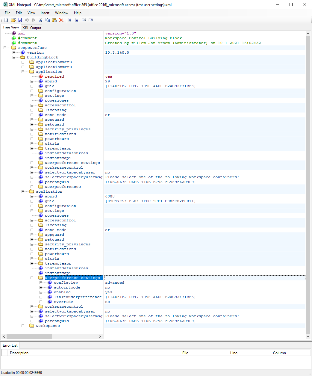 In v0.5 the function Get-XMLDetailsForWorkspaces has been updated. I thought that all the containers are applied are in respowerfuse.buildingblock.workspaces. That is not correct. The GUIDs are mentioned in respowerfuse.buildingblock.application.workspacecontrol and the mapping GUID <-> name is done in respowerfuse.buildingblock.workspaces. You can check the following example: